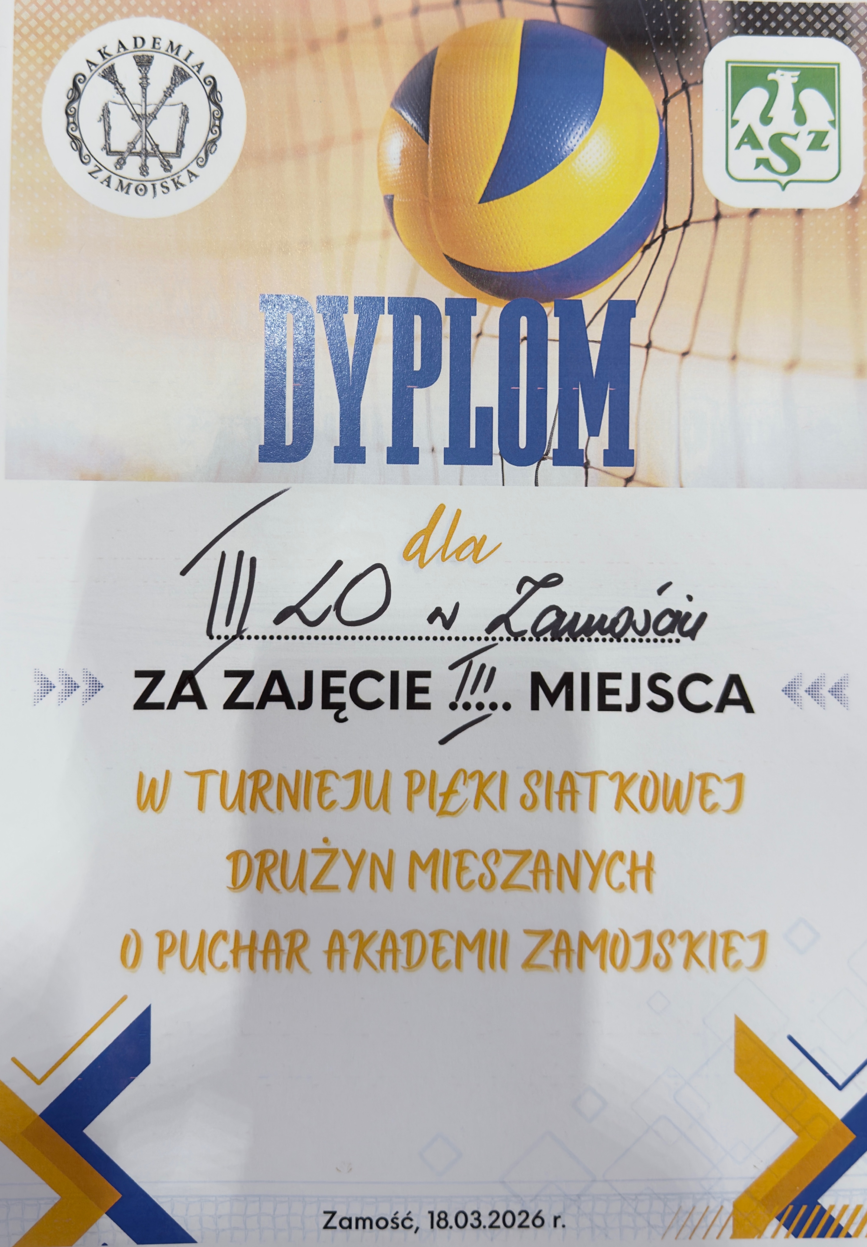 Uczniowie szkoły zajęli 3. miejsce w turnieju piłki siatkowej drużyn mieszanych, który odbył się 18 marca 2026 r. w hali sportowej przy ul. Błonie 1K w Zamościu. Organizatorem wydarzenia była Akademia Zamojska.