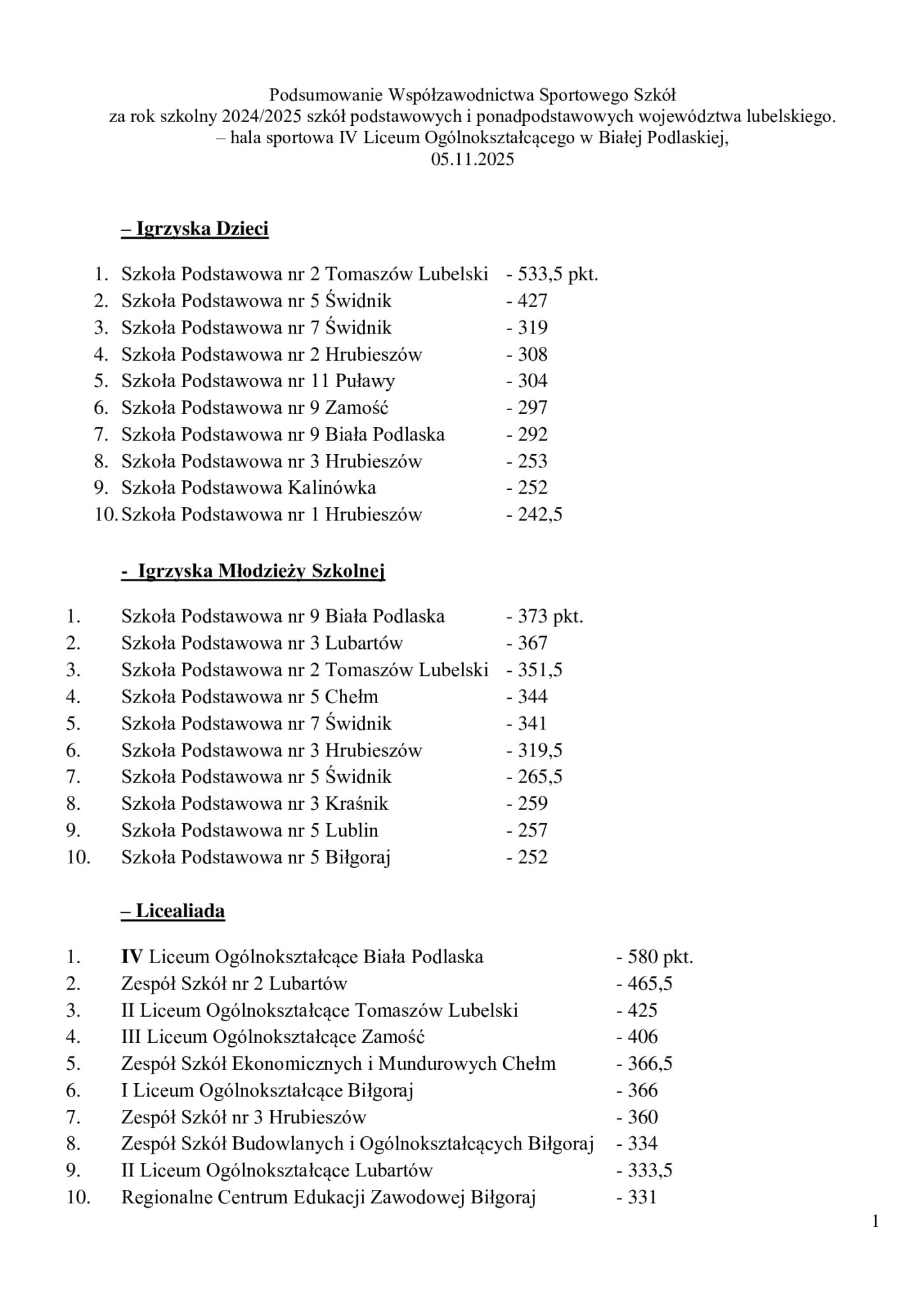 5 listopada 2025 r. w Białej Podlaskiej odbyło się podsumowanie Współzawodnictwa Sportowego Szkół Województwa Lubelskiego za rok szkolny 2024/2025, zorganizowane przez Wojewódzki Szkolny Związek Sportowy w Lublinie.