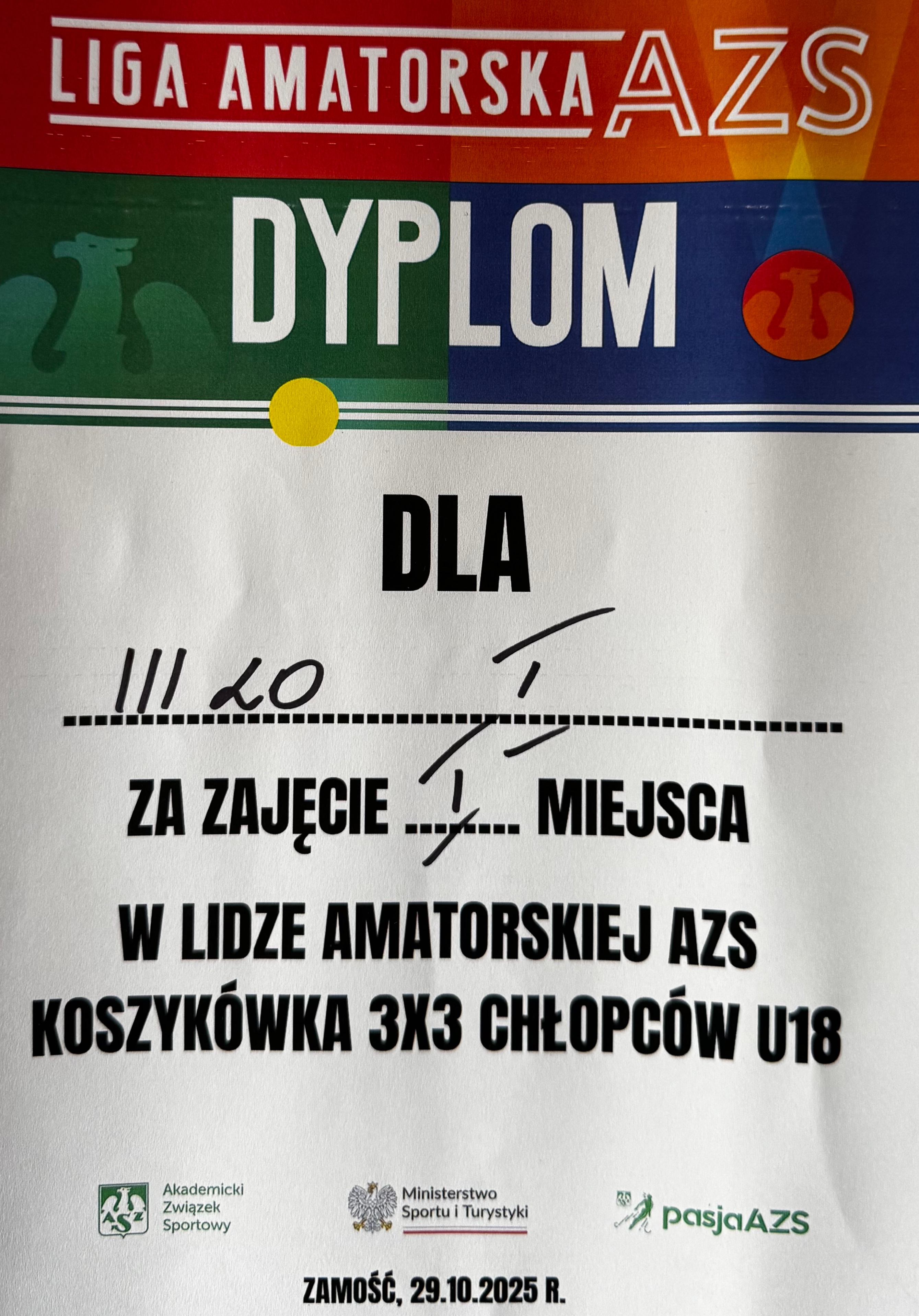 Reprezentacje dziewcząt i chłopców odniosły zwycięstwa w Amatorskiej Lidze AZS w koszykówce 3X3. Turnieje rozegrano 29 i 30 października 2025 r. w hali sportowej Akademii Zamojskiej przy ul. Błonie 1K.