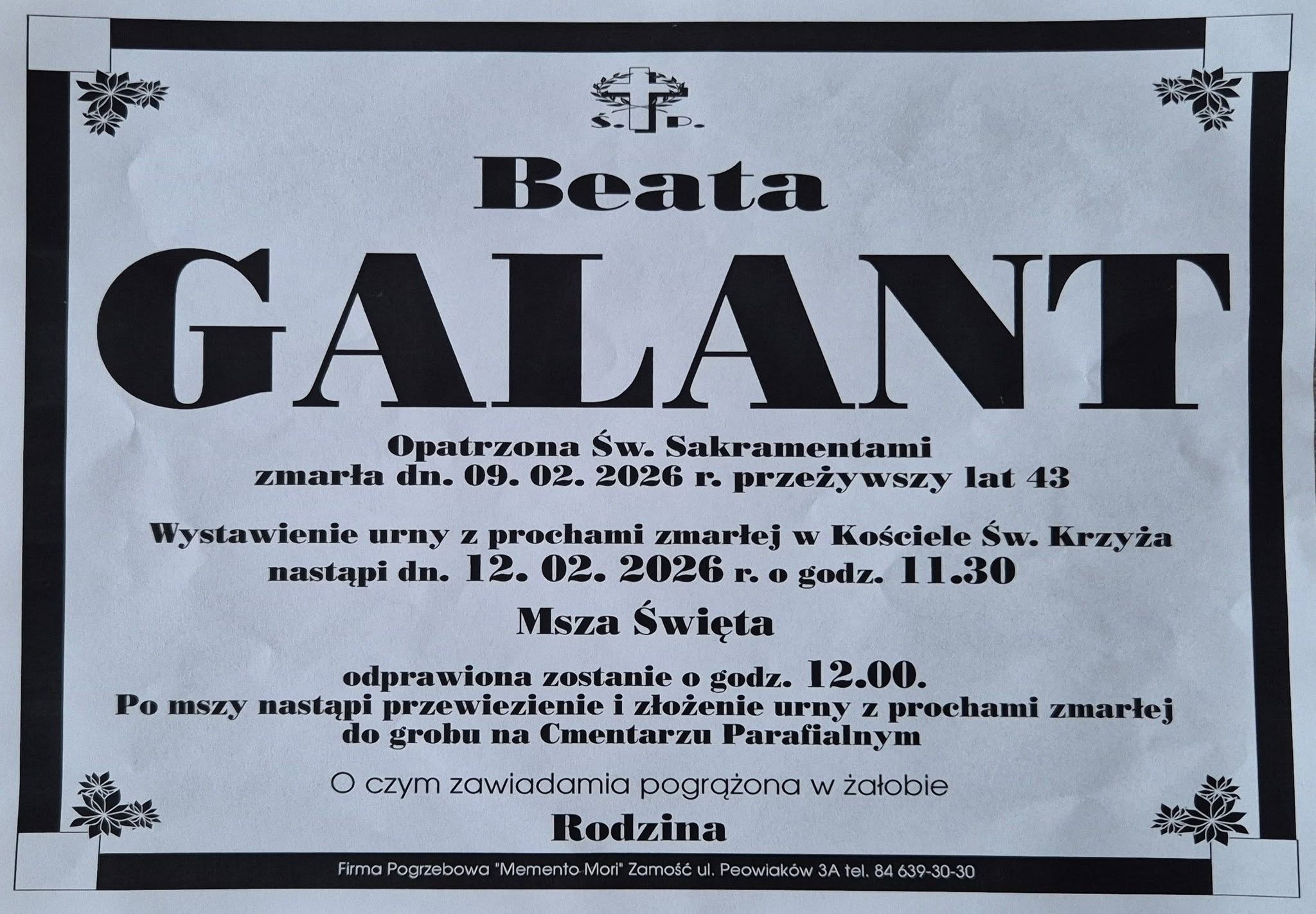 Pogrążeni w ogromnym smutku informujemy o śmierci Pani Beaty Galant – nauczycielki języka polskiego w III Liceum Ogólnokształcącym im. Cypriana Kamila Norwida w Zamościu.