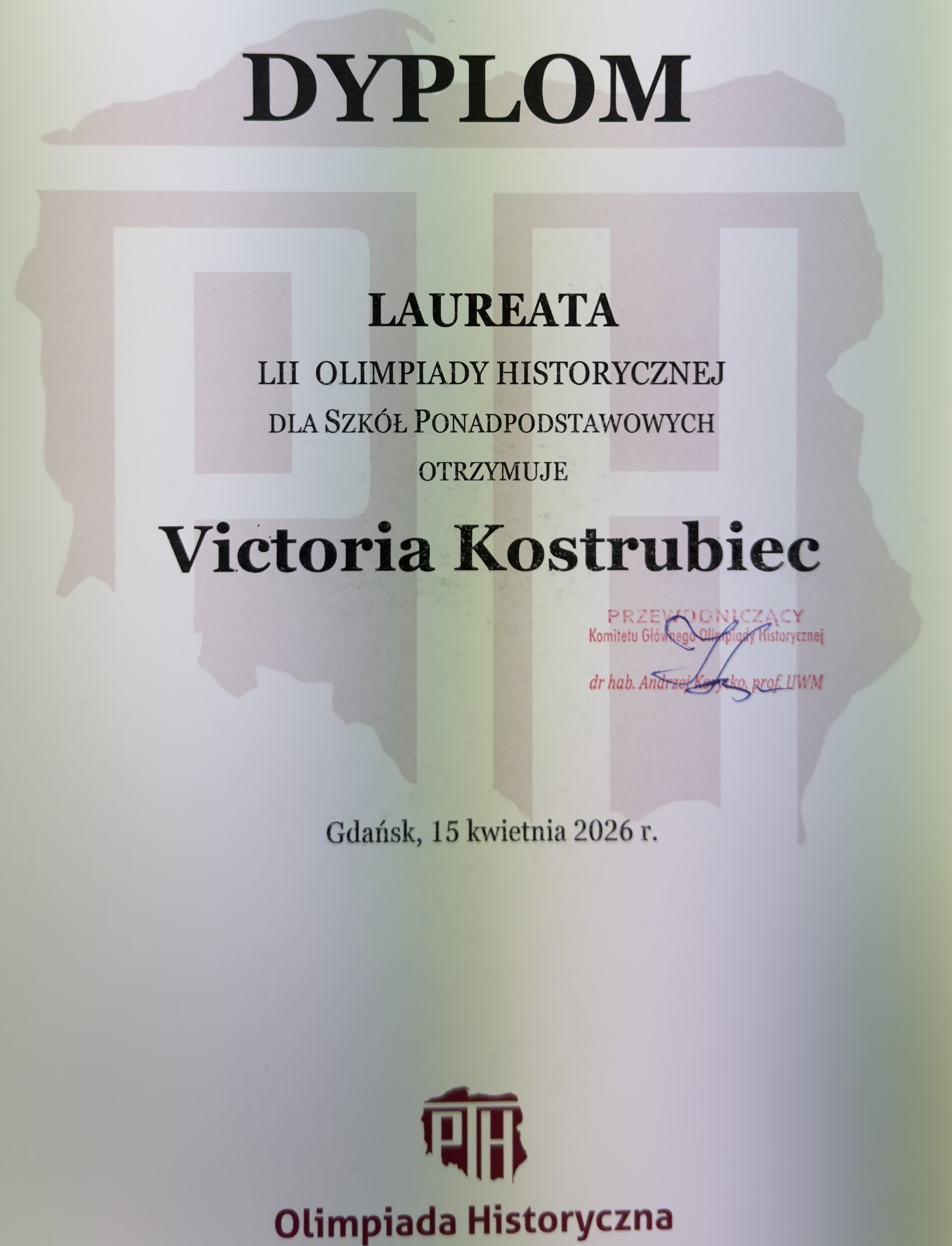 Z wielką radością informujemy, że uczennica Victoria Kostrubiec z klasy 4d zdobyła tytuł laureata LII Ogólnopolskiej Olimpiady Historycznej zorganizowanej przez Polskie Towarzystwo Historyczne. Victoria zamierza studiować prawo. Tytuł laureata gwarantuje przyjęcie na każdą uczelnię w Polsce.