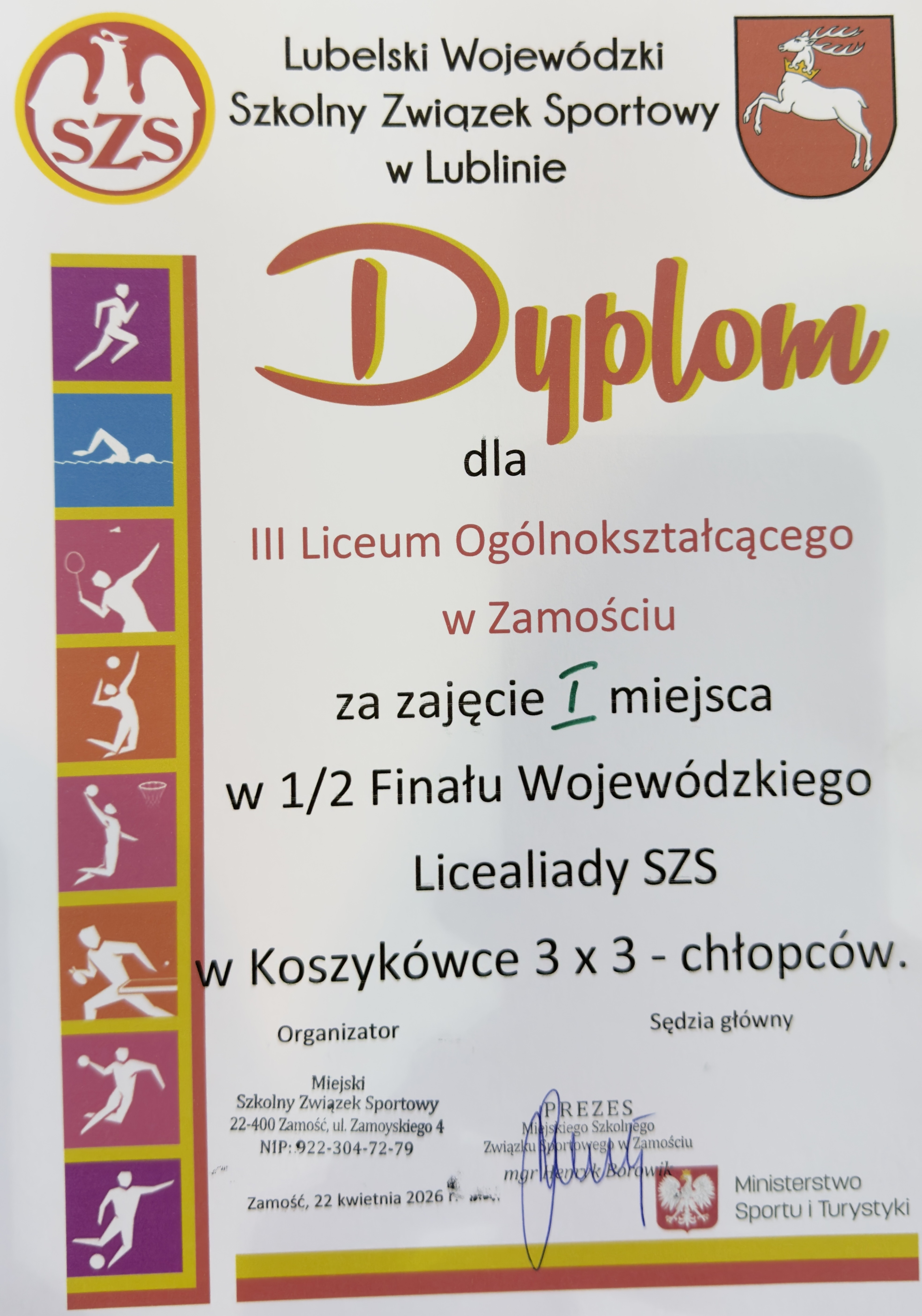 Reprezentacja chłopców w składzie: Wojciech Jabłoński, Dominik Jopek, Mikołaj Marciniewicz oraz Bruno Rybczyński wygrała rejonową licealiadę w koszykówce 3X3, która została rozegrana 22 kwietnia 2026 r. w hali sportowej szkoły, awansując do kolejnego etapu rozgrywek na szczeblu wojewódzkim. Trener: Krzysztof Mazurek.